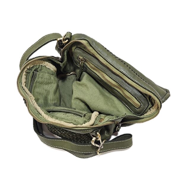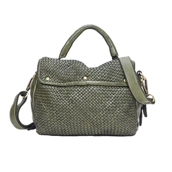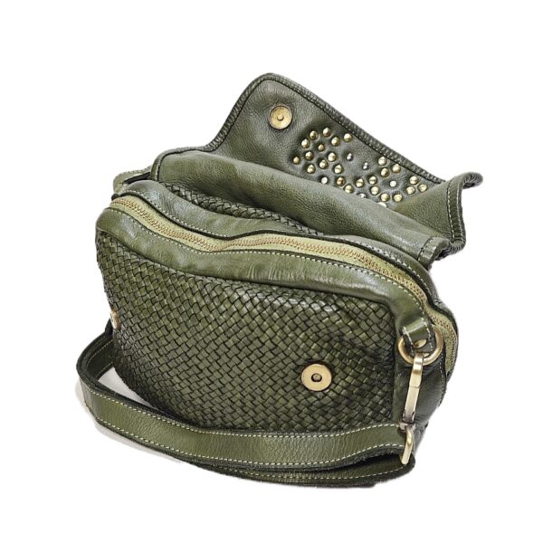 Borsa ALITA in morbida pelle lavata intrecciata patta decorata con borchie e pietre – chiusura a doppio cursore provvista di tracolla regolabile fodera in cotone con tre tasche di cui una con chiusura lampo – accessori in ottone spazzolato