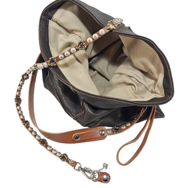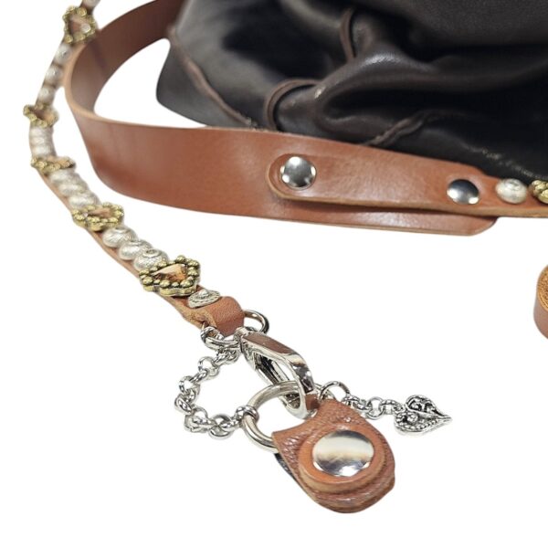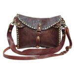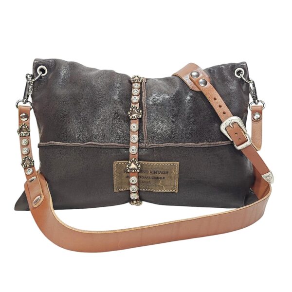 Borsa AMBRA cross body in morbida pelle lavata  / tipo di chiusura cinturino in cuoio avvolgente con bottone magnetico decorato con borchie e pietre / tracolla in cuoio da 3 cm regolabile con fibbia più manicotto / fodera in cotone con bordo interno in pelle. NOTA! NON SONO PRESENTI TESCHE INTERNE