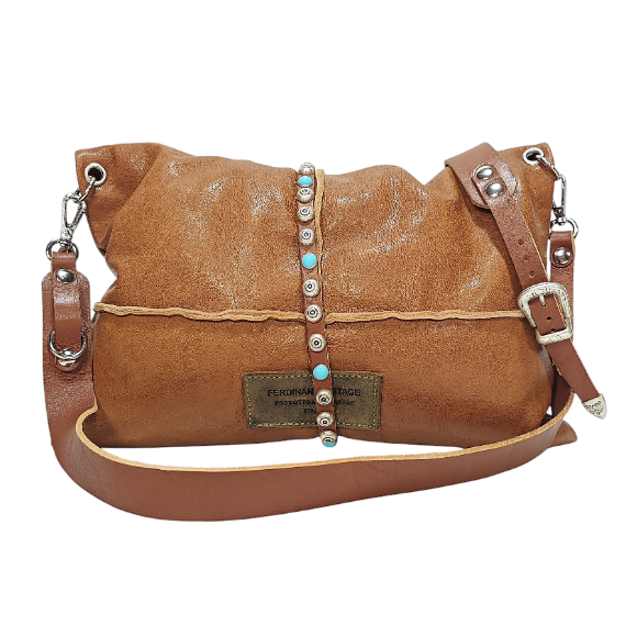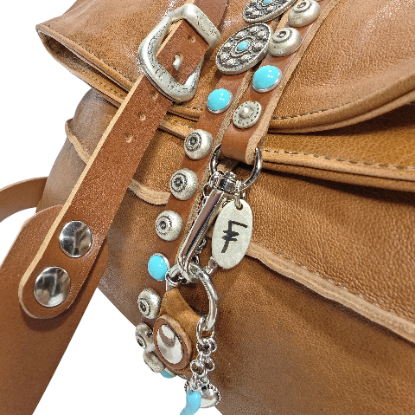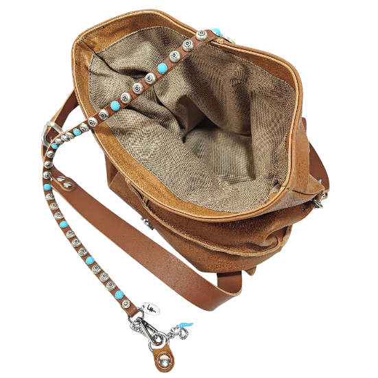 Borsa ELODEA cross body in morbida pelle lavata a concia vegetale/ tipo di chiusura laccio in cuoio girevole con calamita decorato con accessori in Zama/ tracolla in cuoio da 3 cm regolabile con fibbia più manicotto / fodera in cotone con bordo interno in pelle . NON SONO PRESENTI TASCHE INTERNE