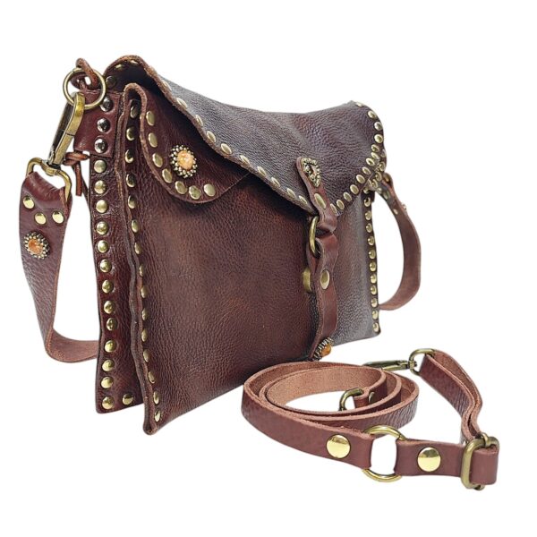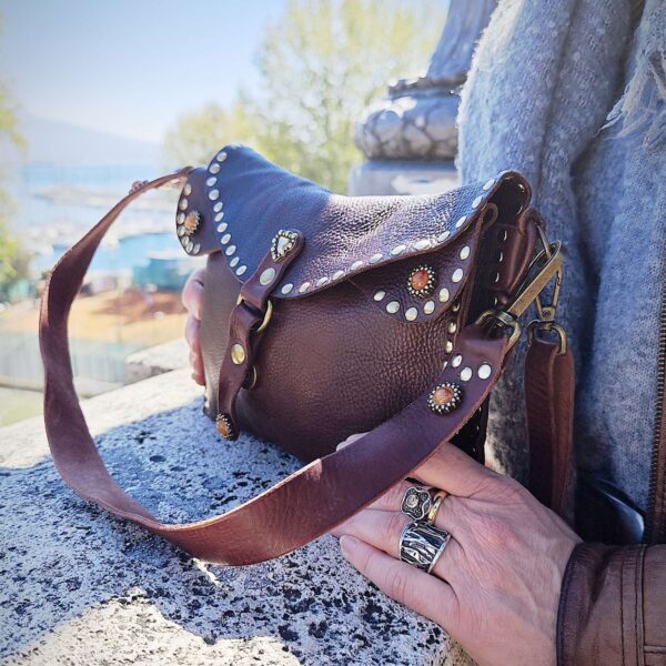Borsa IRENE in vacchetta tinta a mano decorata con borchie e pietre / Tipo di chiusura magnetica / 3 scomparti doppia tracolla una da 1,5 cm e uno spallaccio da 3 cm per la modalità spalla / accessori in ottone spazzolato / sfoderata a taglio vivo