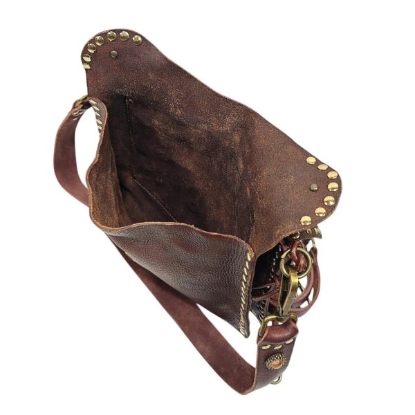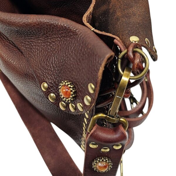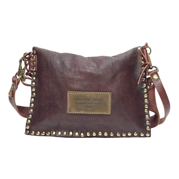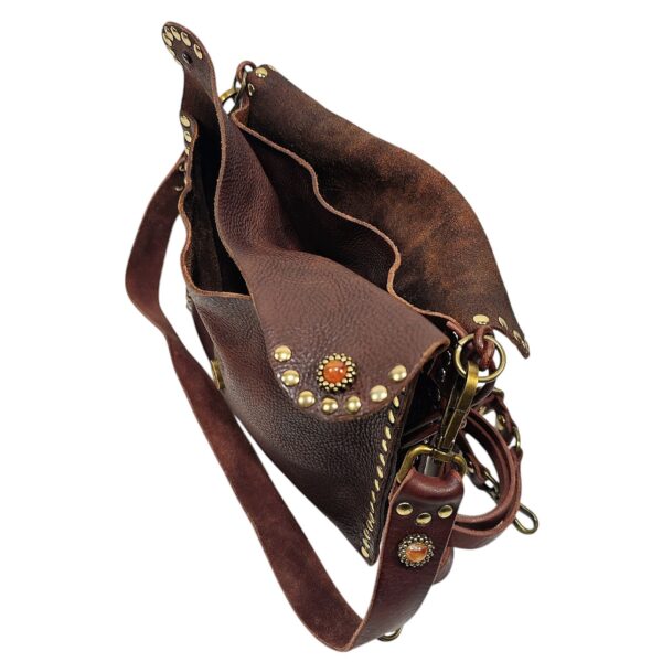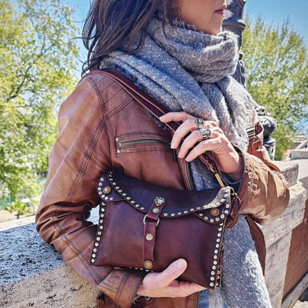 Borsa IRENE in vacchetta tinta a mano decorata con borchie e pietre / Tipo di chiusura magnetica / 3 scomparti doppia tracolla una da 1,5 cm e uno spallaccio da 3 cm per la modalità spalla / accessori in ottone spazzolato / sfoderata a taglio vivo