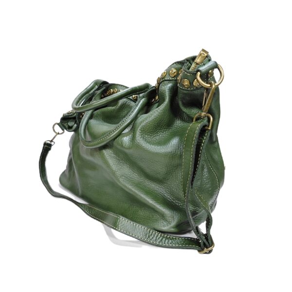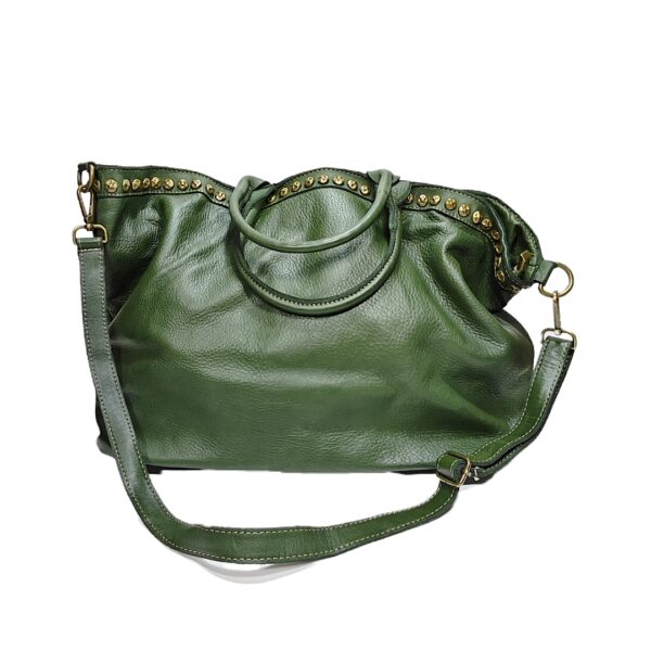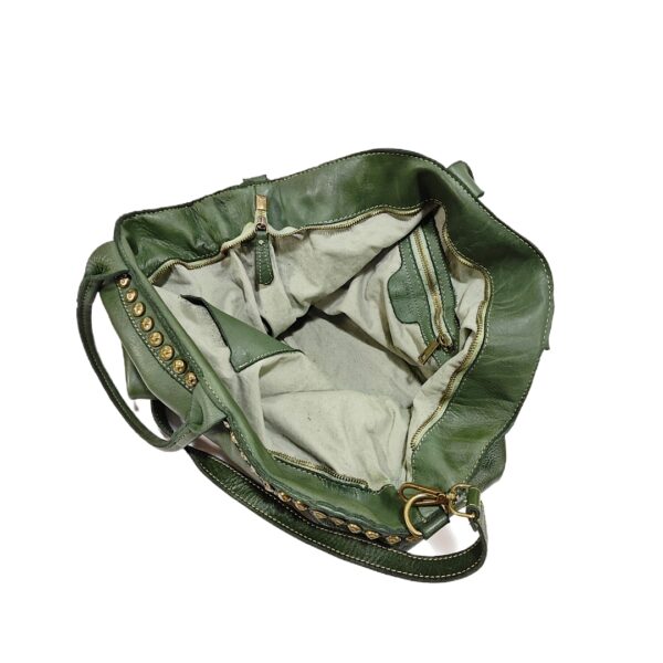 Borsa big shopping LAVINIA in morbida pelle lavata con borchie. chiusura con cerniera zip. fodera in cotone con tre tasche di cui una a cerniera da 18 cm con profilo in pelle. provvista di tracolla regolabile e rimovibile. accessori in ottone spazzolato