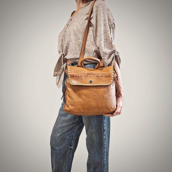 Zainetto MAGNETO multitasche in morbida pelle lavata. provvisto di chiusura a cerniera con patta di media lunghezza decorata con borchie e pietre vestibilità anche in modalità borsa a tracolla. spallacci regolabili fodera in cotone a due scomparti con due tasche di cui una con chiusura lampo e varie tasche esterne. accessori in ottone spazzolato