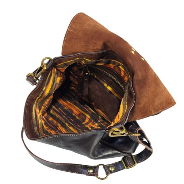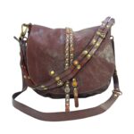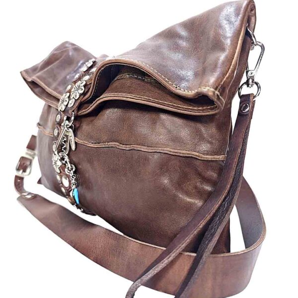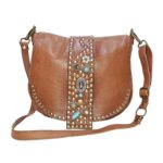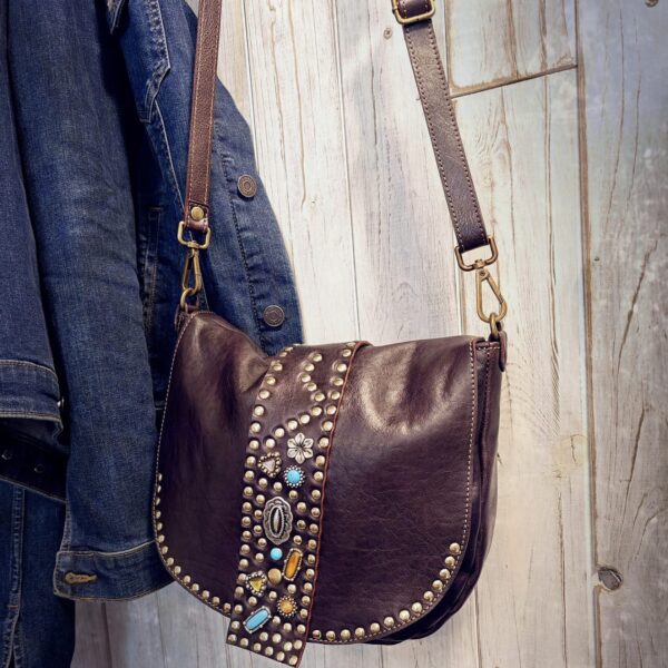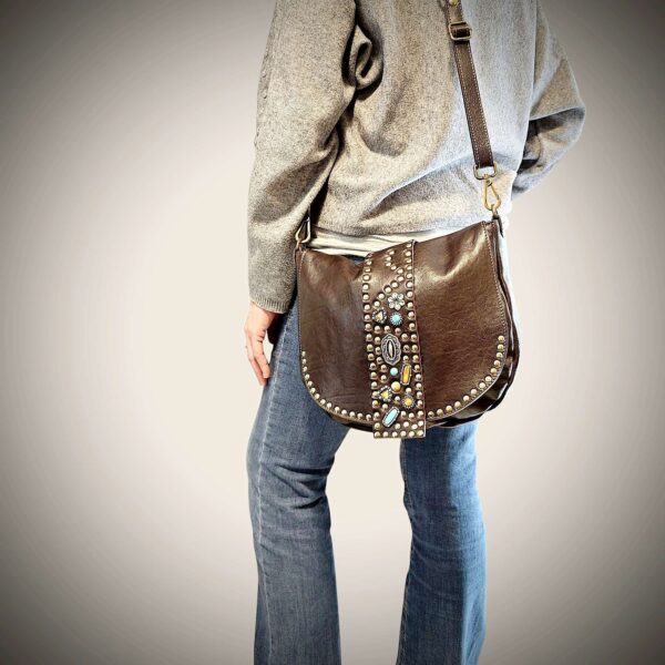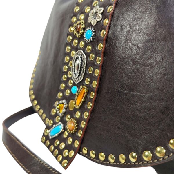 Borsa Donna in pelle vacchetta modello Tolfa a patta lunga decorata con pietre e borchie in zama / Tipo di chiusura magnetica / tracolla da 2 cm regolabile / fodera in cotone e tasca con chiusura lampo da 20 cm con profilo in pelle più taschino.