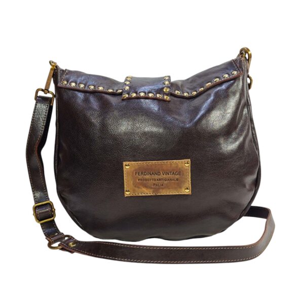 Borsa Donna in pelle vacchetta modello Tolfa a patta lunga decorata con pietre e borchie in zama / Tipo di chiusura magnetica / tracolla da 2 cm regolabile / fodera in cotone e tasca con chiusura lampo da 20 cm con profilo in pelle più taschino.