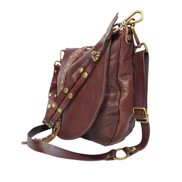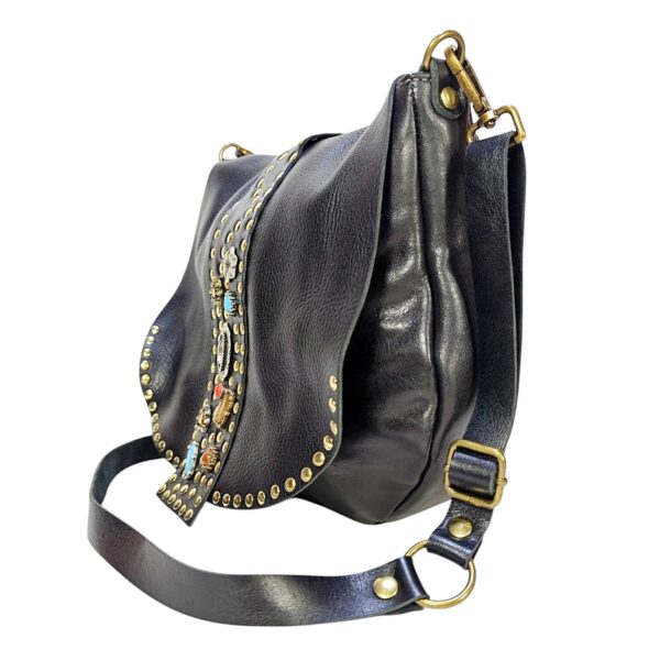 Borsa Donna in pelle vacchetta modello Tolfa a patta lunga decorata con pietre e borchie in zama / Tipo di chiusura magnetica / tracolla da 2 cm regolabile / fodera in cotone e tasca con chiusura lampo da 20 cm con profilo in pelle più taschino.