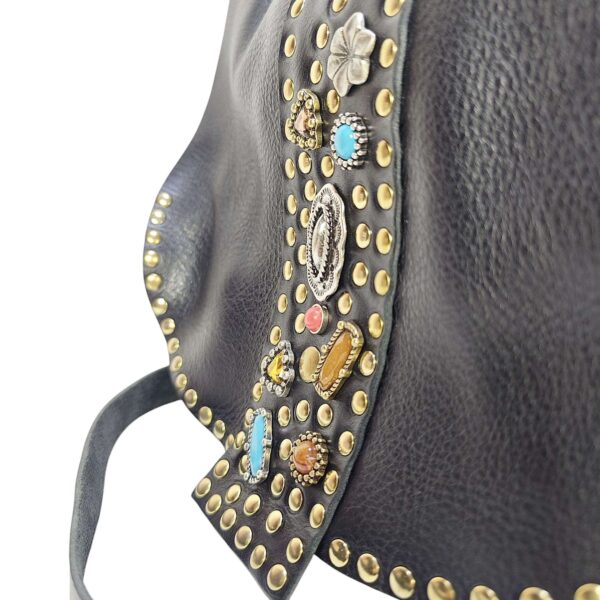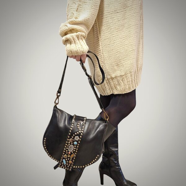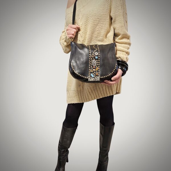 Ho acquistato la borsa a tracolla Mina di Ferdinando Vintage e ne sono rimasta entusiasta! Realizzata in pelle nera di ottima qualità, è decorata con pietre colorate e borchie che la rendono davvero originale e dallo stile unico. La grandezza è perfetta: capiente ma non ingombrante, ideale sia per l’ufficio che per uscire.