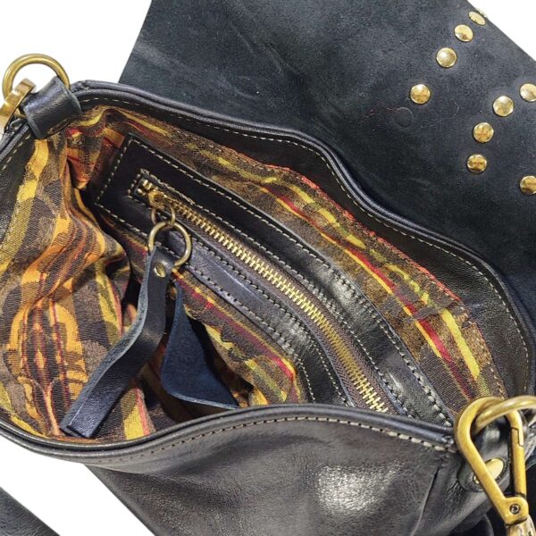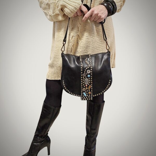 Borsa Donna in pelle vacchetta modello Tolfa a patta lunga decorata con pietre e borchie in zama / Tipo di chiusura magnetica / tracolla da 2 cm regolabile / fodera in cotone e tasca con chiusura lampo da 20 cm con profilo in pelle più taschino.
