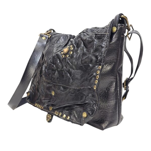 Borsa NADIA in pelle modello Tolfa a patta lunga con effetto stropicciato / Tipo di chiusura magnetica / tracolla in cuoio da 2,5 cm regolabile / fodera in cotone con chiusura lampo da 20 cm più taschino / accessori in ottone spazzolato