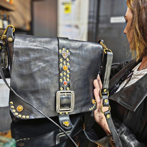 Borsa SOFIA in vacchetta tinta a mano a patta lunga decorata con borchie e pietre / Tipo di chiusura magnetica / tracolla in cuoio da 2 cm regolabile / fodera in cotone tasca con chiusura lampo da 20 cm più taschino / accessori in ottone spazzolato