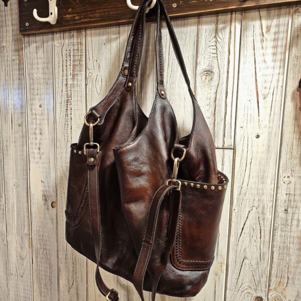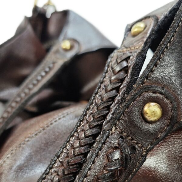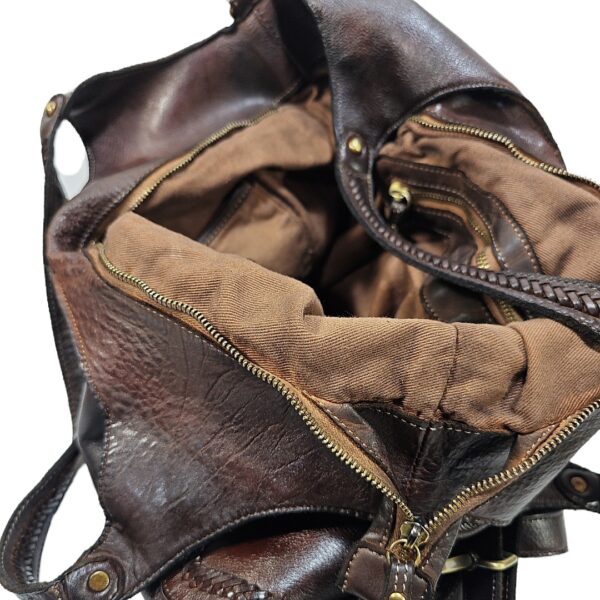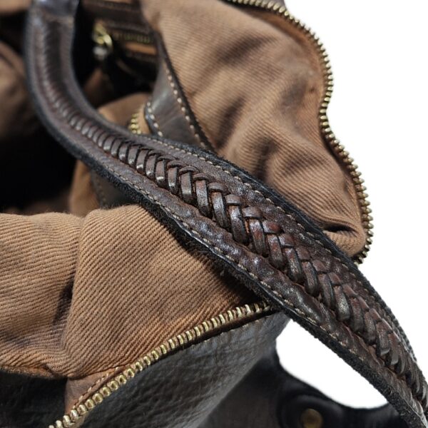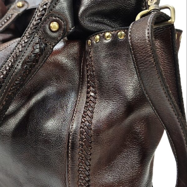 Borsa shopping “VANESSA EDIZIONE LIMITATA” in morbida pelle tamponata a mano con sfumature. due tasche laterali e manici con dettagli intrecciati chiusura con cerniera zip. fodera in cotone con tre tasche di cui una a cerniera. provvista di tracolla regolabile e rimovibile. accessori in ottone spazzolato